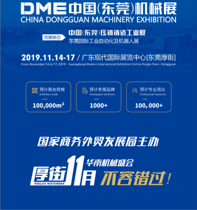 在當前“中國制造”邁向“中國智造”的關(guān)鍵時期,展覽業(yè)也在不斷助力智造升級。2019全新 DME中國東莞機械展將于11月14-17日在東莞厚街·廣東現(xiàn)代國際展覽中心舉辦。